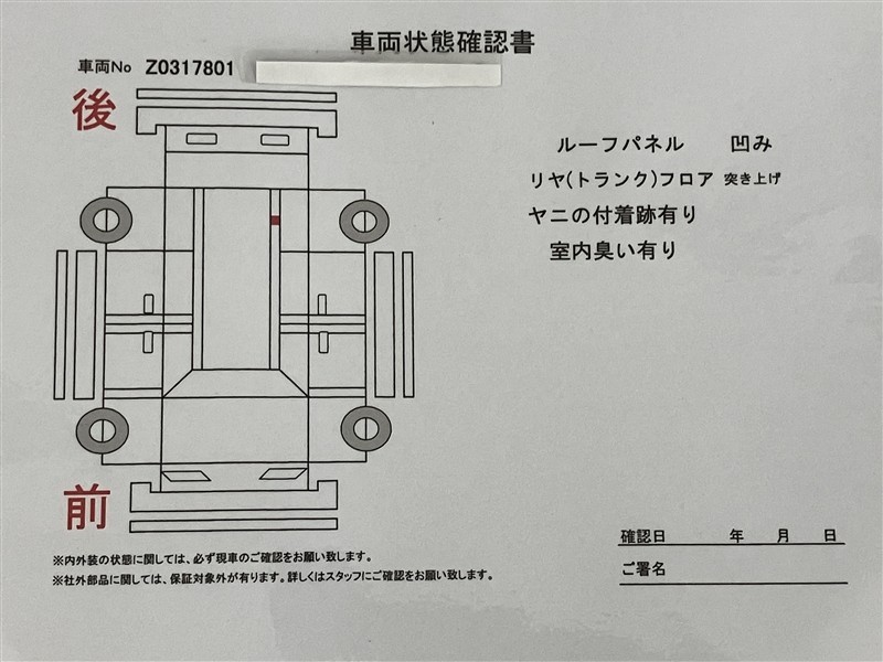 - 「定期点検整備なし(要整備箇所あり)」の場合、整備箇所につきましては、販売店へお問合せください。