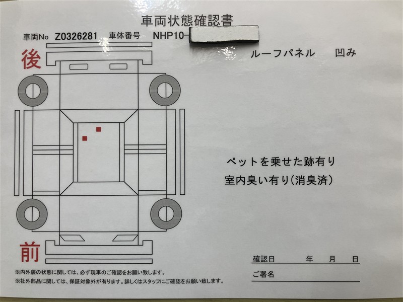 詳細及び現状の車両状態につきましては、店舗スタッフまでお尋ねください。 - 注2)上記と同様の評価点・状態表を「車両検査証明書」として店舗の展示車両に搭載しております。