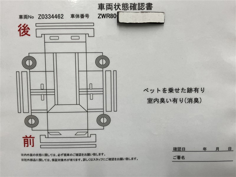 詳細及び現状の車両状態につきましては、店舗スタッフまでお尋ねください。 - 注2)上記と同様の評価点・状態表を「車両検査証明書」として店舗の展示車両に搭載しております。