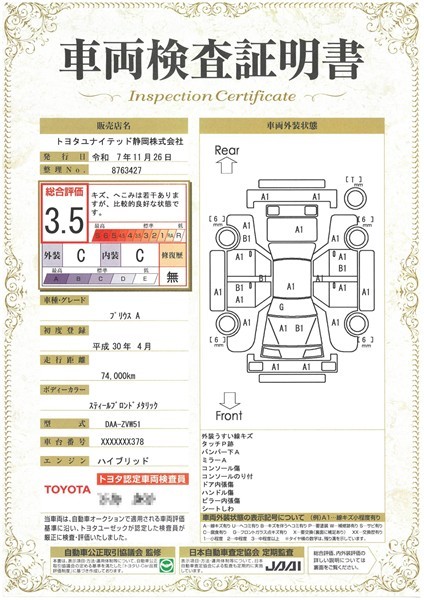 詳細及び現状の車両状態につきましては、店舗スタッフまでお尋ねください。 - 注2)上記と同様の評価点・状態表を「車両検査証明書」として店舗の展示車両に搭載しております。