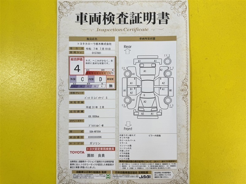 詳細及び現状の車両状態につきましては、店舗スタッフまでお尋ねください。 - 注2)上記と同様の評価点・状態表を「車両検査証明書」として店舗の展示車両に搭載しております。