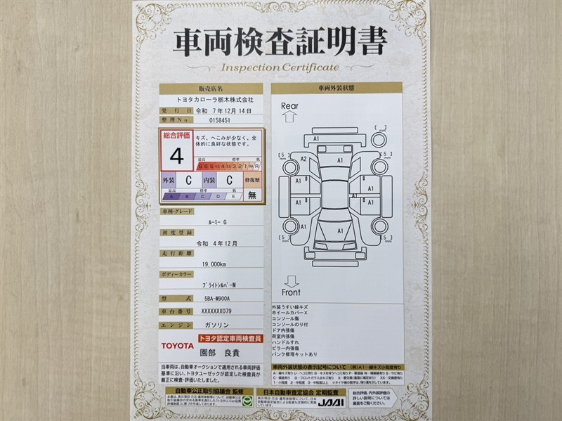 詳細及び現状の車両状態につきましては、店舗スタッフまでお尋ねください。 - 注2)上記と同様の評価点・状態表を「車両検査証明書」として店舗の展示車両に搭載しております。