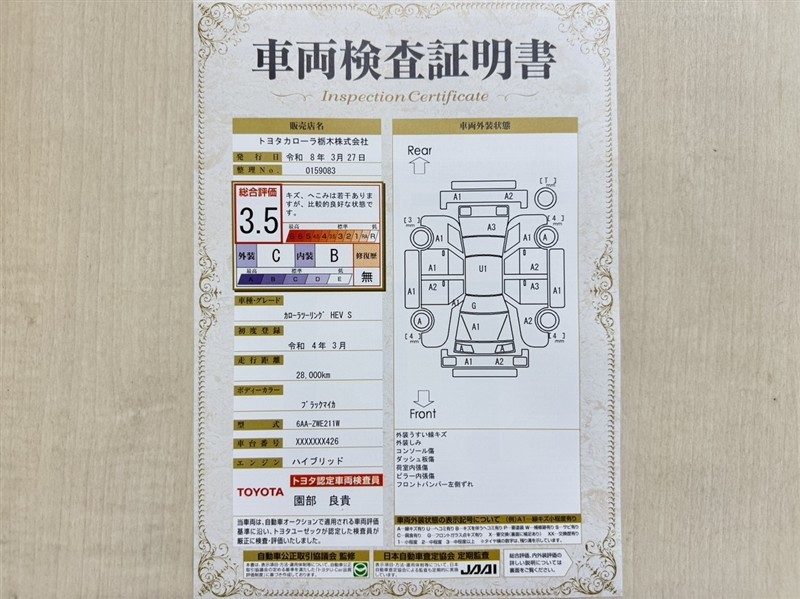 詳細及び現状の車両状態につきましては、店舗スタッフまでお尋ねください。 - 注2)上記と同様の評価点・状態表を「車両検査証明書」として店舗の展示車両に搭載しております。