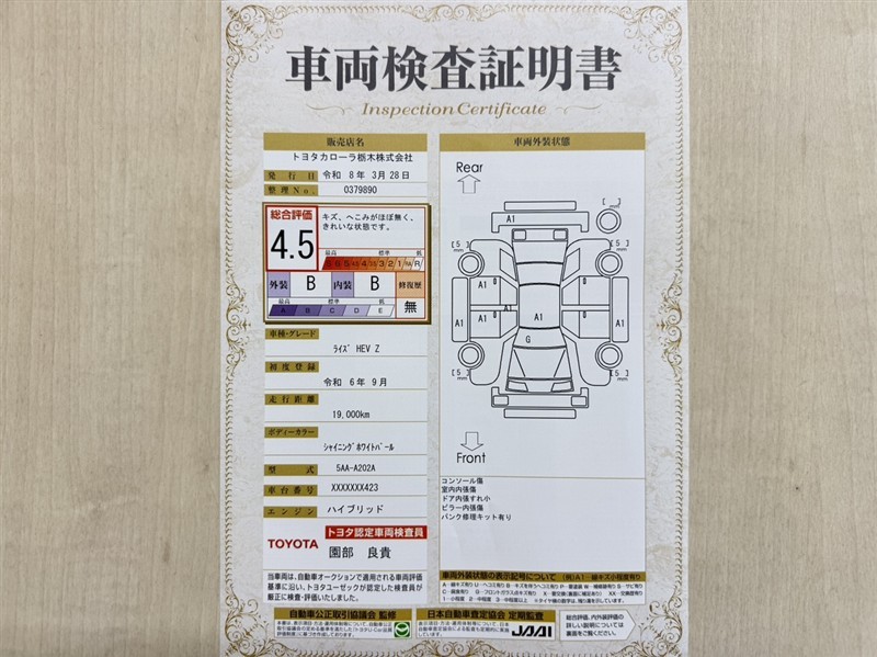 詳細及び現状の車両状態につきましては、店舗スタッフまでお尋ねください。 - 注2)上記と同様の評価点・状態表を「車両検査証明書」として店舗の展示車両に搭載しております。