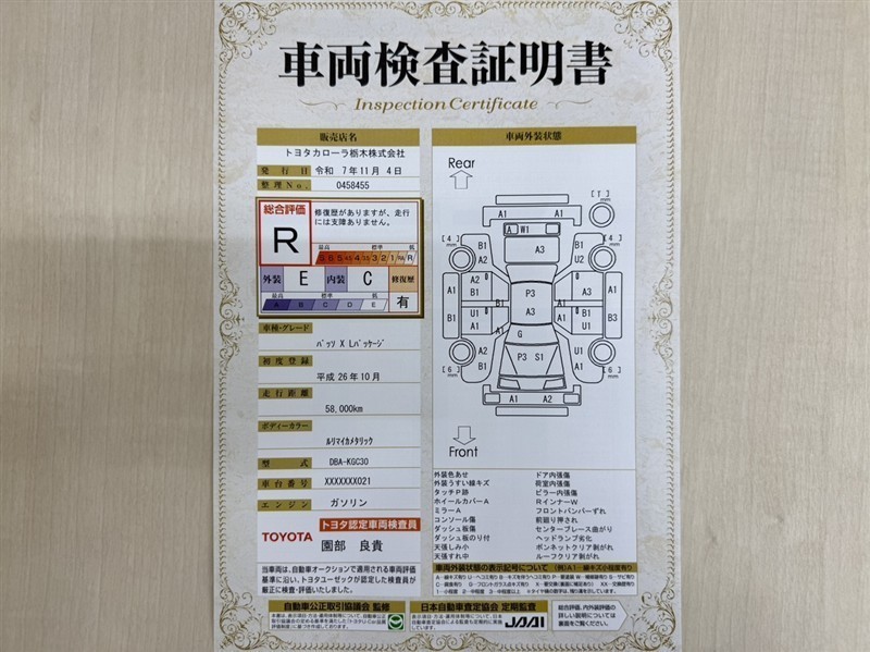詳細及び現状の車両状態につきましては、店舗スタッフまでお尋ねください。 - 注2)上記と同様の評価点・状態表を「車両検査証明書」として店舗の展示車両に搭載しております。