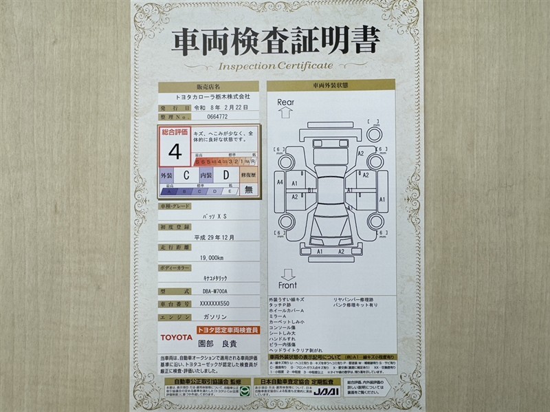詳細及び現状の車両状態につきましては、店舗スタッフまでお尋ねください。 - 注2)上記と同様の評価点・状態表を「車両検査証明書」として店舗の展示車両に搭載しております。