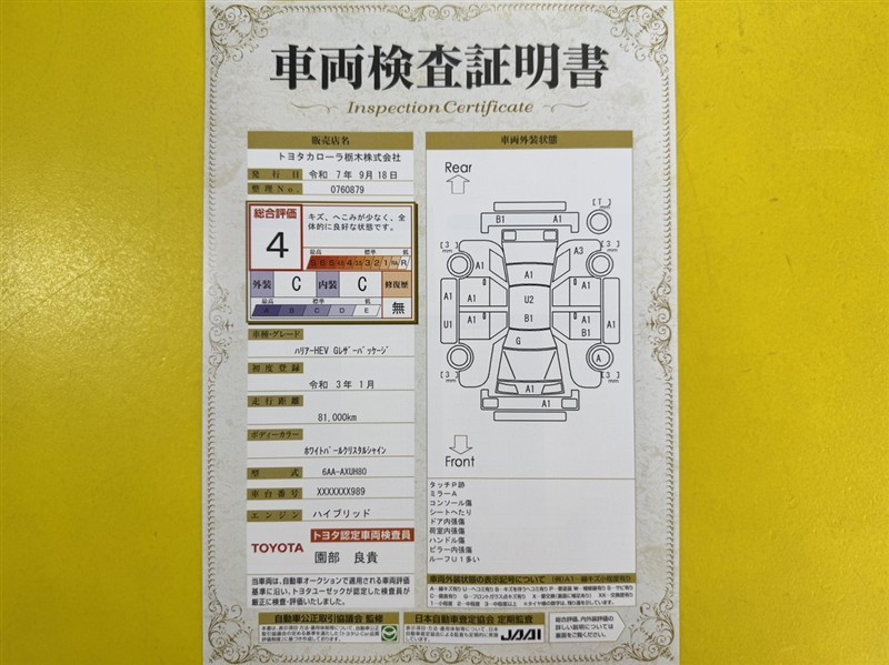詳細及び現状の車両状態につきましては、店舗スタッフまでお尋ねください。 - 注2)上記と同様の評価点・状態表を「車両検査証明書」として店舗の展示車両に搭載しております。