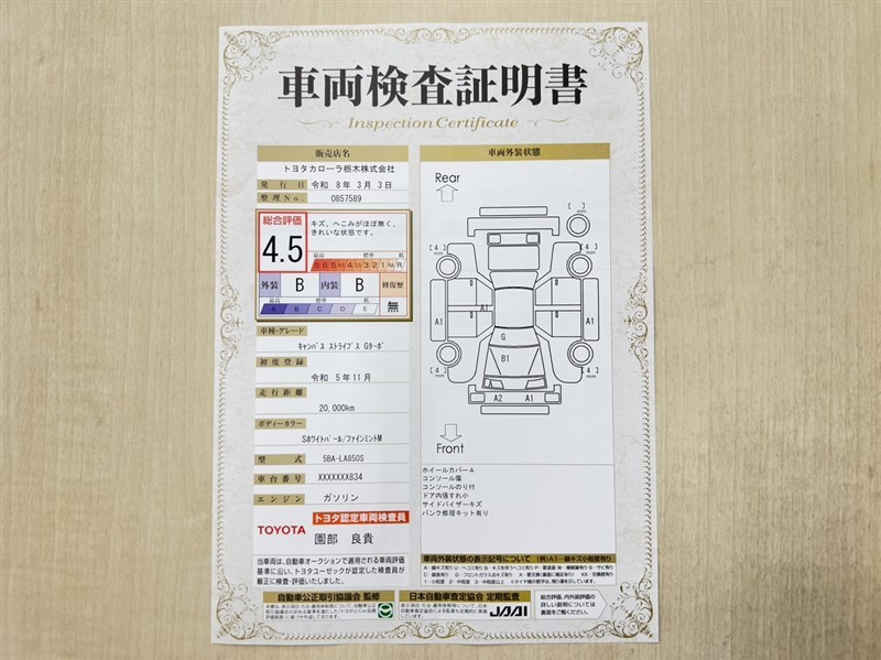 詳細及び現状の車両状態につきましては、店舗スタッフまでお尋ねください。 - 注2)上記と同様の評価点・状態表を「車両検査証明書」として店舗の展示車両に搭載しております。