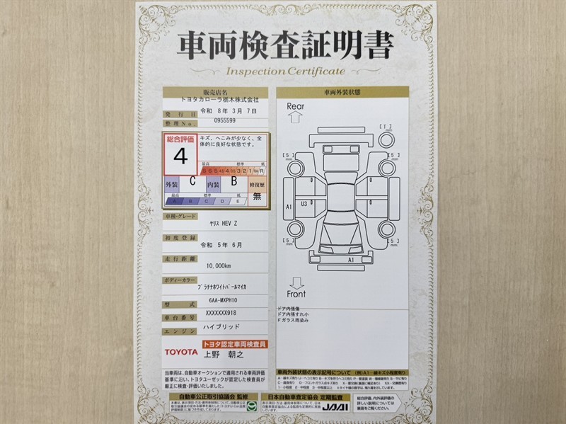 詳細及び現状の車両状態につきましては、店舗スタッフまでお尋ねください。 - 注2)上記と同様の評価点・状態表を「車両検査証明書」として店舗の展示車両に搭載しております。