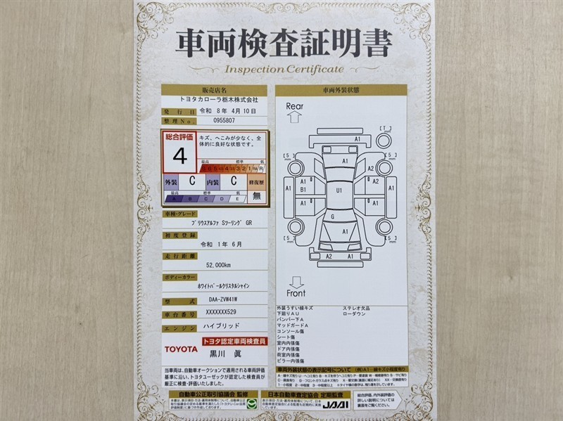 詳細及び現状の車両状態につきましては、店舗スタッフまでお尋ねください。 - 注2)上記と同様の評価点・状態表を「車両検査証明書」として店舗の展示車両に搭載しております。