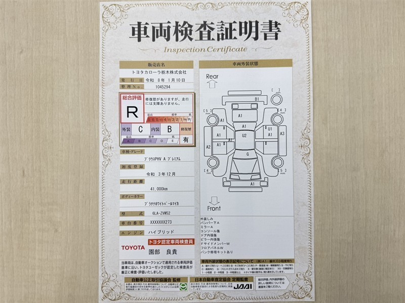 詳細及び現状の車両状態につきましては、店舗スタッフまでお尋ねください。 - 注2)上記と同様の評価点・状態表を「車両検査証明書」として店舗の展示車両に搭載しております。