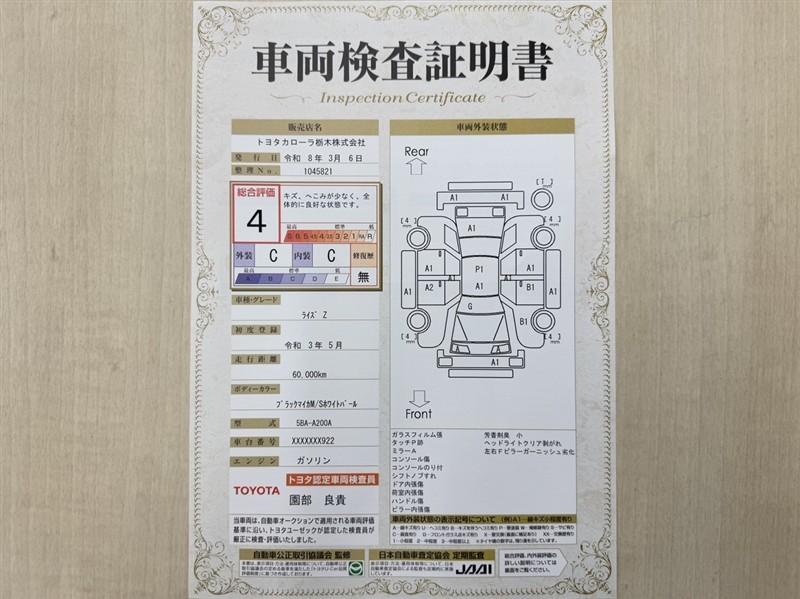 詳細及び現状の車両状態につきましては、店舗スタッフまでお尋ねください。 - 注2)上記と同様の評価点・状態表を「車両検査証明書」として店舗の展示車両に搭載しております。