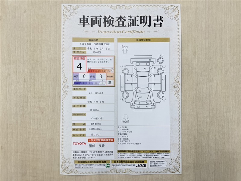 詳細及び現状の車両状態につきましては、店舗スタッフまでお尋ねください。 - 注2)上記と同様の評価点・状態表を「車両検査証明書」として店舗の展示車両に搭載しております。