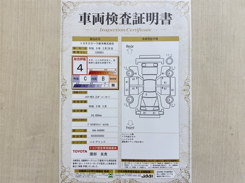 詳細及び現状の車両状態につきましては、店舗スタッフまでお尋ねください。 - 注2)上記と同様の評価点・状態表を「車両検査証明書」として店舗の展示車両に搭載しております。