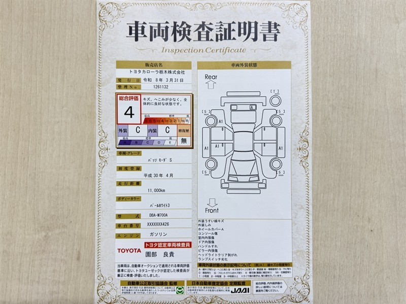 詳細及び現状の車両状態につきましては、店舗スタッフまでお尋ねください。 - 注2)上記と同様の評価点・状態表を「車両検査証明書」として店舗の展示車両に搭載しております。