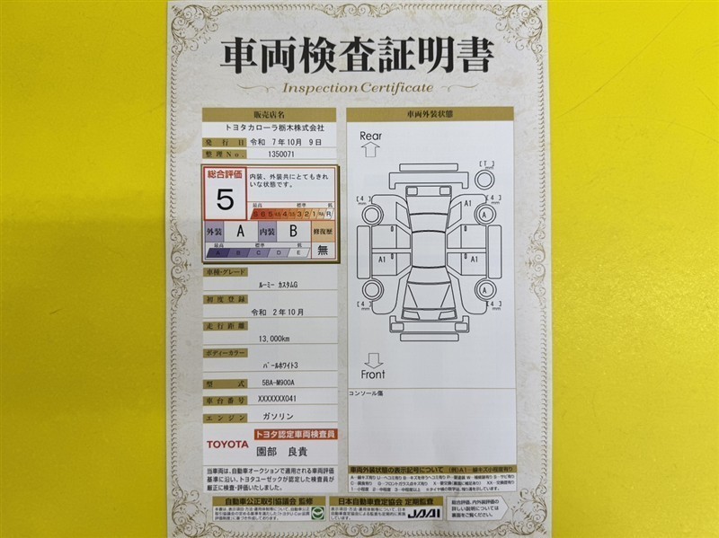 詳細及び現状の車両状態につきましては、店舗スタッフまでお尋ねください。 - 注2)上記と同様の評価点・状態表を「車両検査証明書」として店舗の展示車両に搭載しております。