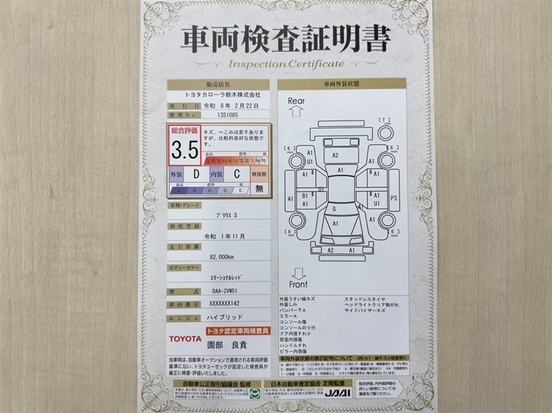 詳細及び現状の車両状態につきましては、店舗スタッフまでお尋ねください。 - 注2)上記と同様の評価点・状態表を「車両検査証明書」として店舗の展示車両に搭載しております。