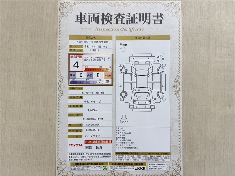 詳細及び現状の車両状態につきましては、店舗スタッフまでお尋ねください。 - 注2)上記と同様の評価点・状態表を「車両検査証明書」として店舗の展示車両に搭載しております。