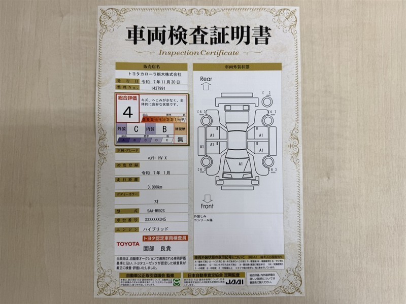 詳細及び現状の車両状態につきましては、店舗スタッフまでお尋ねください。 - 注2)上記と同様の評価点・状態表を「車両検査証明書」として店舗の展示車両に搭載しております。