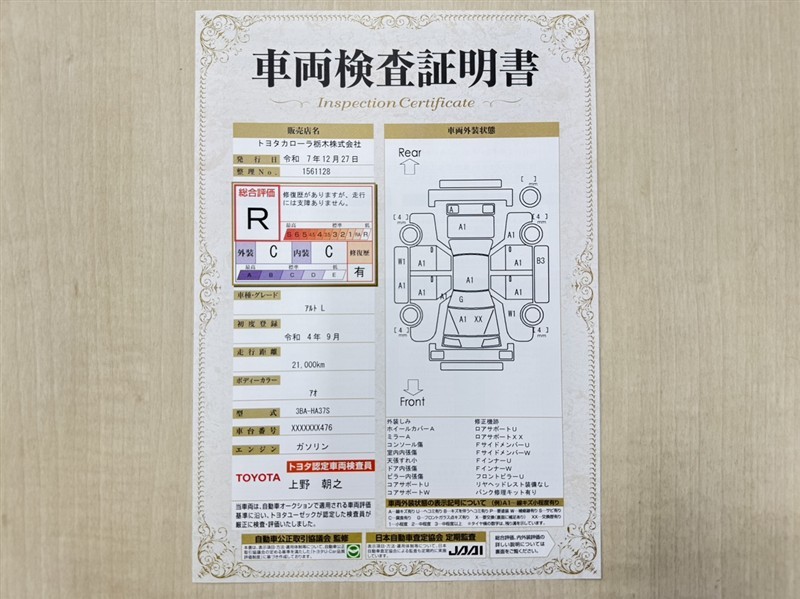 詳細及び現状の車両状態につきましては、店舗スタッフまでお尋ねください。 - 注2)上記と同様の評価点・状態表を「車両検査証明書」として店舗の展示車両に搭載しております。