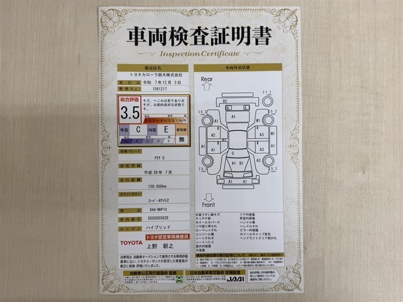 詳細及び現状の車両状態につきましては、店舗スタッフまでお尋ねください。 - 注2)上記と同様の評価点・状態表を「車両検査証明書」として店舗の展示車両に搭載しております。