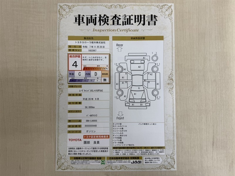 詳細及び現状の車両状態につきましては、店舗スタッフまでお尋ねください。 - 注2)上記と同様の評価点・状態表を「車両検査証明書」として店舗の展示車両に搭載しております。