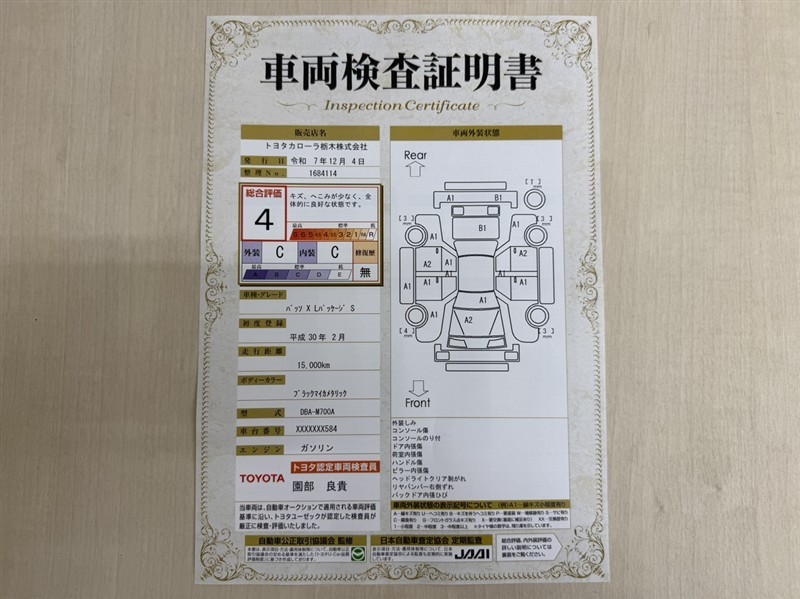 詳細及び現状の車両状態につきましては、店舗スタッフまでお尋ねください。 - 注2)上記と同様の評価点・状態表を「車両検査証明書」として店舗の展示車両に搭載しております。