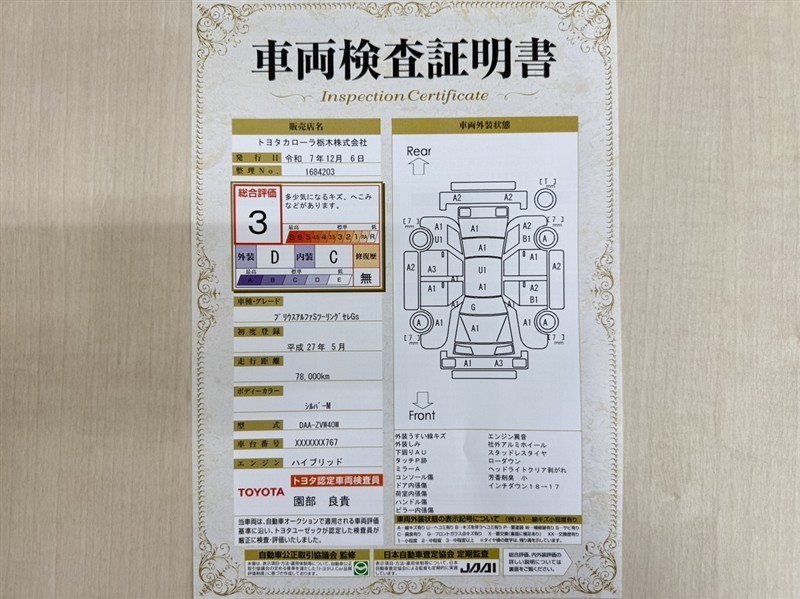 詳細及び現状の車両状態につきましては、店舗スタッフまでお尋ねください。 - 注2)上記と同様の評価点・状態表を「車両検査証明書」として店舗の展示車両に搭載しております。