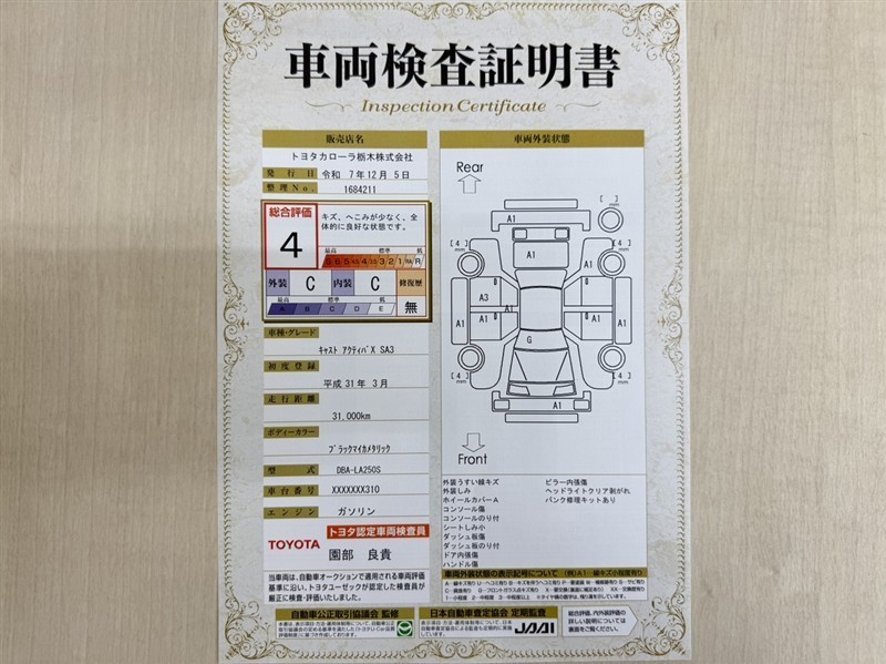 詳細及び現状の車両状態につきましては、店舗スタッフまでお尋ねください。 - 注2)上記と同様の評価点・状態表を「車両検査証明書」として店舗の展示車両に搭載しております。