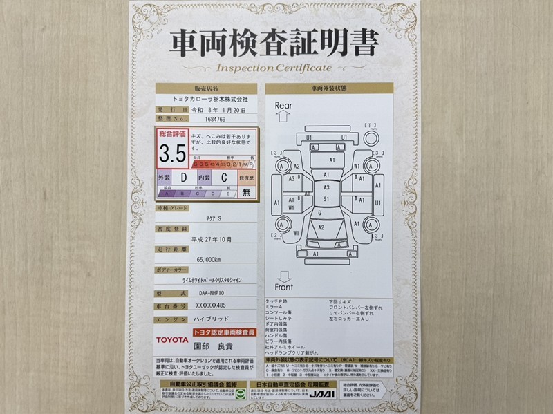 詳細及び現状の車両状態につきましては、店舗スタッフまでお尋ねください。 - 注2)上記と同様の評価点・状態表を「車両検査証明書」として店舗の展示車両に搭載しております。
