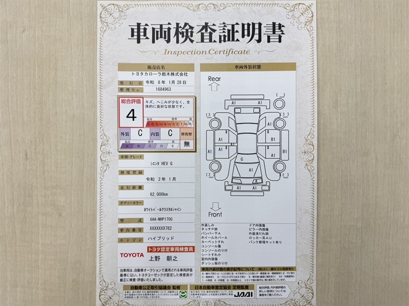 詳細及び現状の車両状態につきましては、店舗スタッフまでお尋ねください。 - 注2)上記と同様の評価点・状態表を「車両検査証明書」として店舗の展示車両に搭載しております。