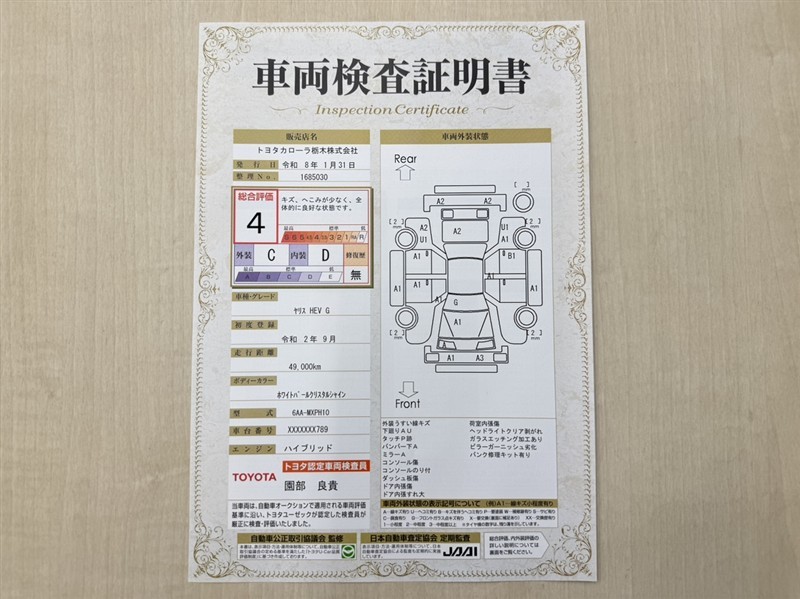 詳細及び現状の車両状態につきましては、店舗スタッフまでお尋ねください。 - 注2)上記と同様の評価点・状態表を「車両検査証明書」として店舗の展示車両に搭載しております。