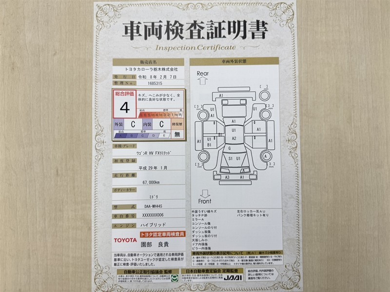詳細及び現状の車両状態につきましては、店舗スタッフまでお尋ねください。 - 注2)上記と同様の評価点・状態表を「車両検査証明書」として店舗の展示車両に搭載しております。