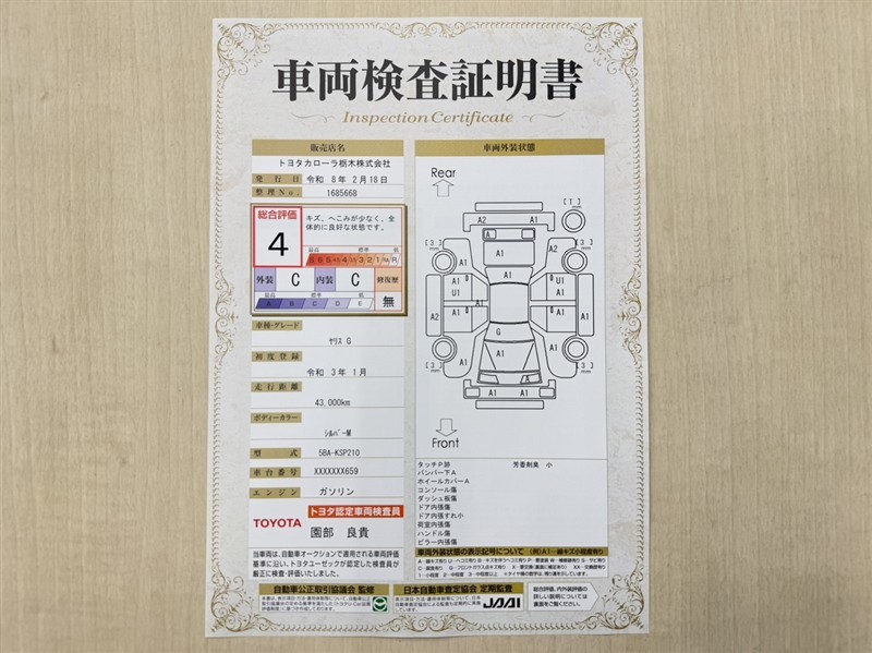 詳細及び現状の車両状態につきましては、店舗スタッフまでお尋ねください。 - 注2)上記と同様の評価点・状態表を「車両検査証明書」として店舗の展示車両に搭載しております。