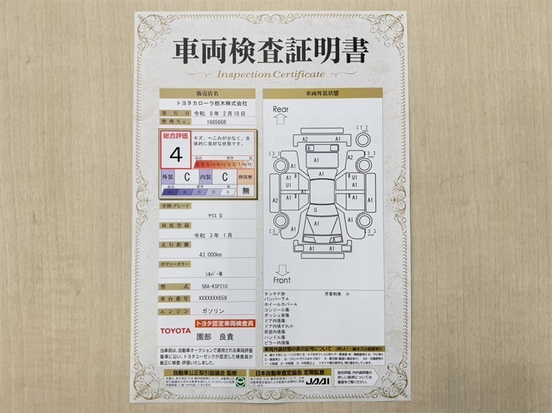- 表示項目・方法・運用体制等について、自動車公正取引協議会の定める基準を満たした「トヨタU-Car品質評価制度」に基づき作成しております。