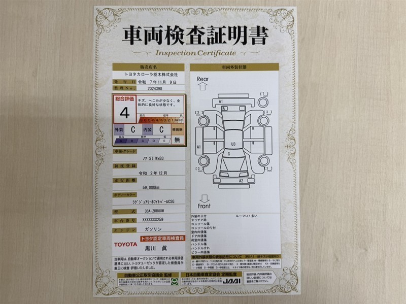 詳細及び現状の車両状態につきましては、店舗スタッフまでお尋ねください。 - 注2)上記と同様の評価点・状態表を「車両検査証明書」として店舗の展示車両に搭載しております。