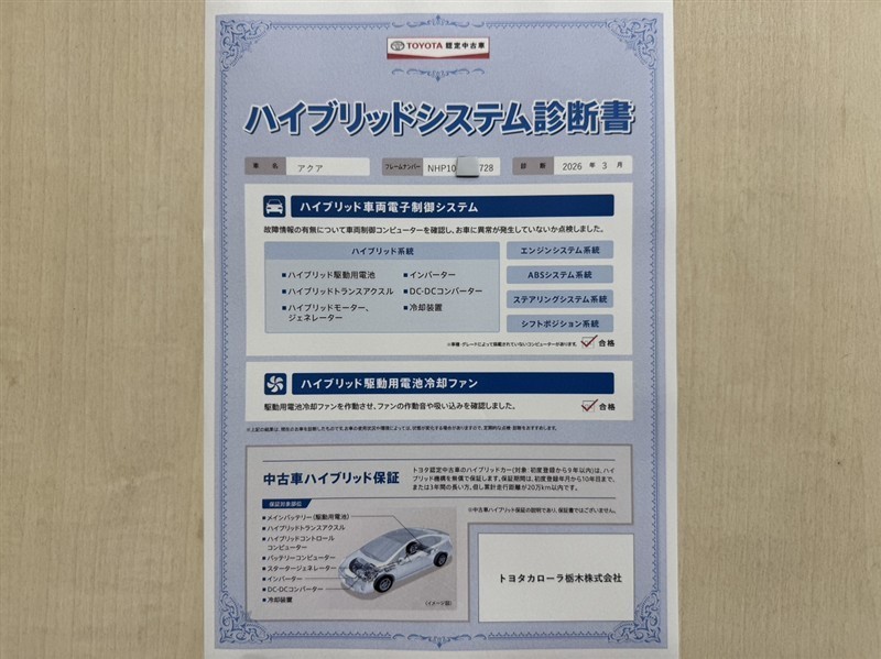 | 保証内容※1 | 保証付:ロングラン保証1年<走行距離無制限> +ハイブリッド保証<保証期間は初度登録年月から10年目まで、もしくは3年間のいずれか長い方。但し走行距離20万キロまで> |