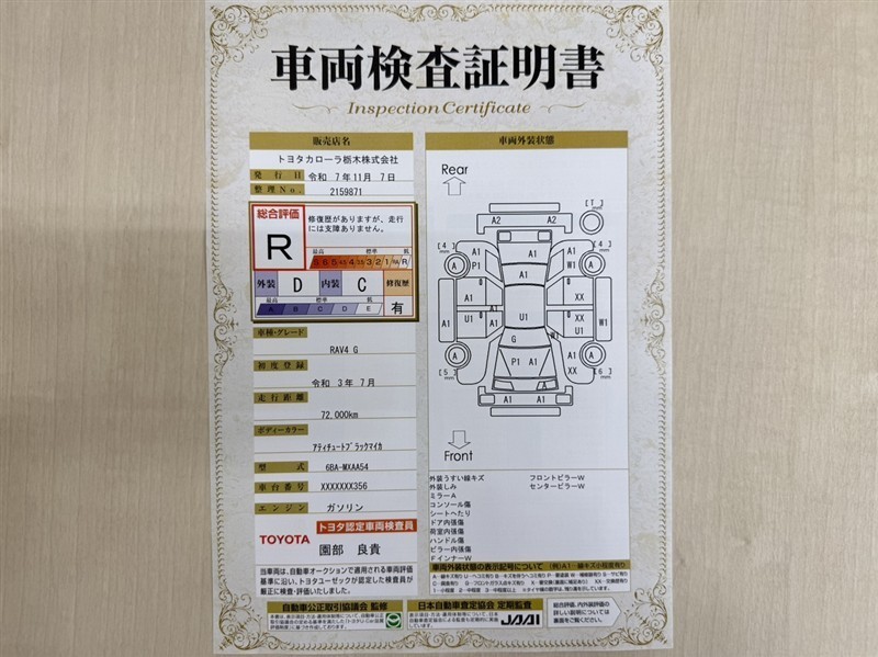詳細及び現状の車両状態につきましては、店舗スタッフまでお尋ねください。 - 注2)上記と同様の評価点・状態表を「車両検査証明書」として店舗の展示車両に搭載しております。