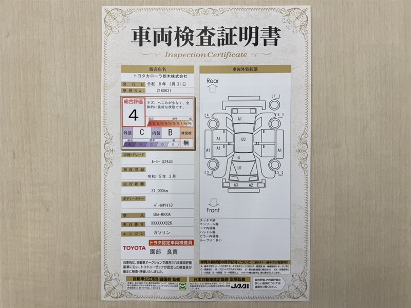 詳細及び現状の車両状態につきましては、店舗スタッフまでお尋ねください。 - 注2)上記と同様の評価点・状態表を「車両検査証明書」として店舗の展示車両に搭載しております。