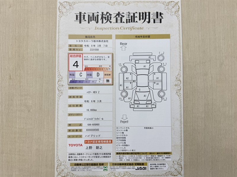 詳細及び現状の車両状態につきましては、店舗スタッフまでお尋ねください。 - 注2)上記と同様の評価点・状態表を「車両検査証明書」として店舗の展示車両に搭載しております。