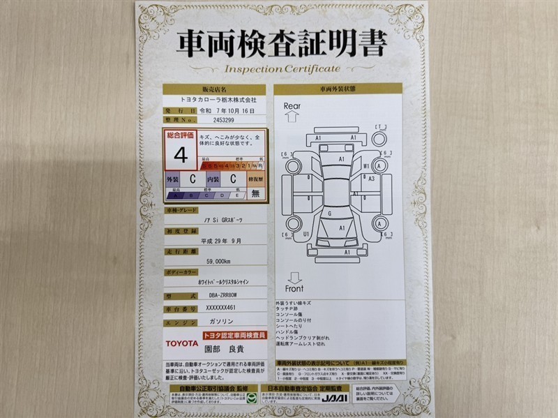 詳細及び現状の車両状態につきましては、店舗スタッフまでお尋ねください。 - 注2)上記と同様の評価点・状態表を「車両検査証明書」として店舗の展示車両に搭載しております。