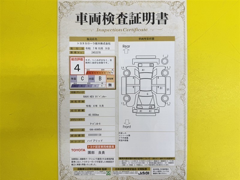 詳細及び現状の車両状態につきましては、店舗スタッフまでお尋ねください。 - 注2)上記と同様の評価点・状態表を「車両検査証明書」として店舗の展示車両に搭載しております。