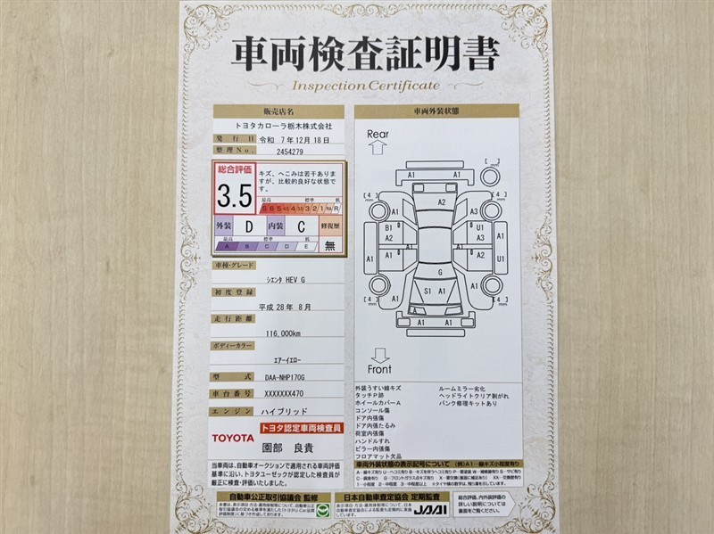 詳細及び現状の車両状態につきましては、店舗スタッフまでお尋ねください。 - 注2)上記と同様の評価点・状態表を「車両検査証明書」として店舗の展示車両に搭載しております。