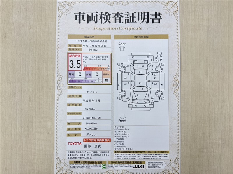 詳細及び現状の車両状態につきましては、店舗スタッフまでお尋ねください。 - 注2)上記と同様の評価点・状態表を「車両検査証明書」として店舗の展示車両に搭載しております。