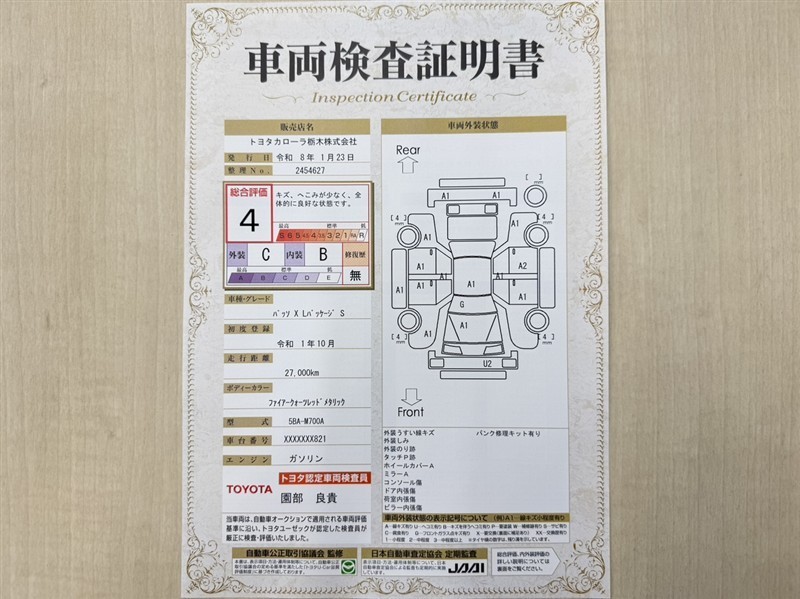 詳細及び現状の車両状態につきましては、店舗スタッフまでお尋ねください。 - 注2)上記と同様の評価点・状態表を「車両検査証明書」として店舗の展示車両に搭載しております。