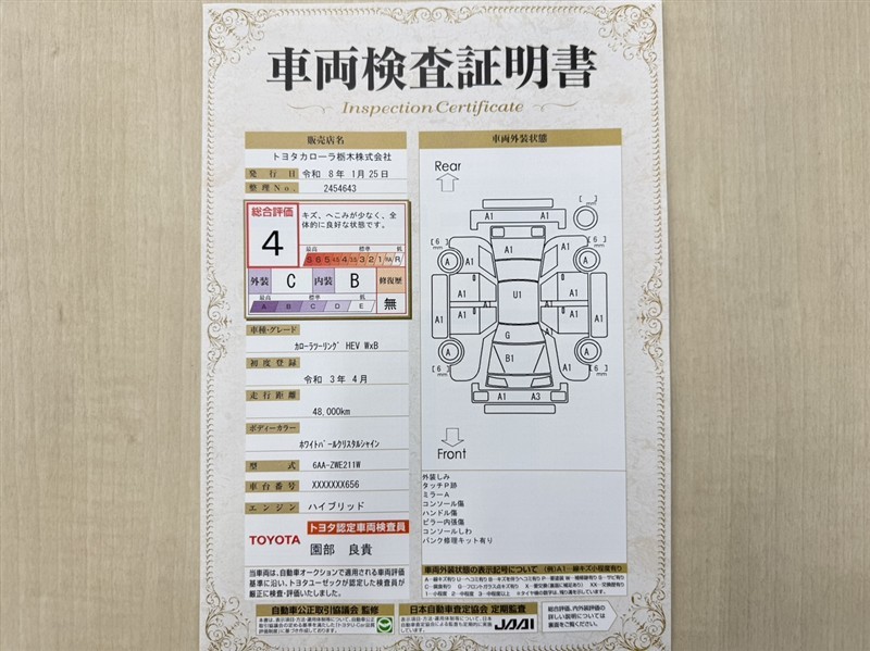 詳細及び現状の車両状態につきましては、店舗スタッフまでお尋ねください。 - 注2)上記と同様の評価点・状態表を「車両検査証明書」として店舗の展示車両に搭載しております。