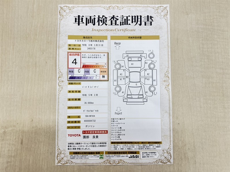 詳細及び現状の車両状態につきましては、店舗スタッフまでお尋ねください。 - 注2)上記と同様の評価点・状態表を「車両検査証明書」として店舗の展示車両に搭載しております。