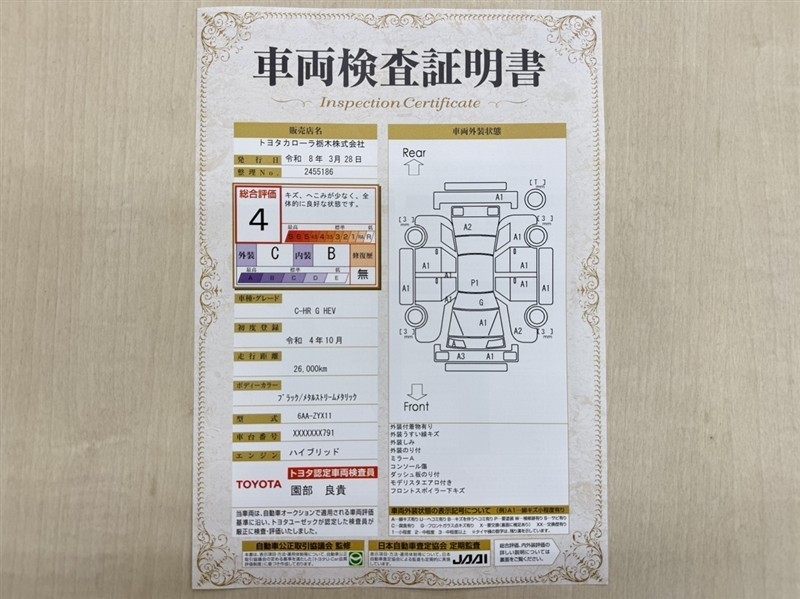 詳細及び現状の車両状態につきましては、店舗スタッフまでお尋ねください。 - 注2)上記と同様の評価点・状態表を「車両検査証明書」として店舗の展示車両に搭載しております。