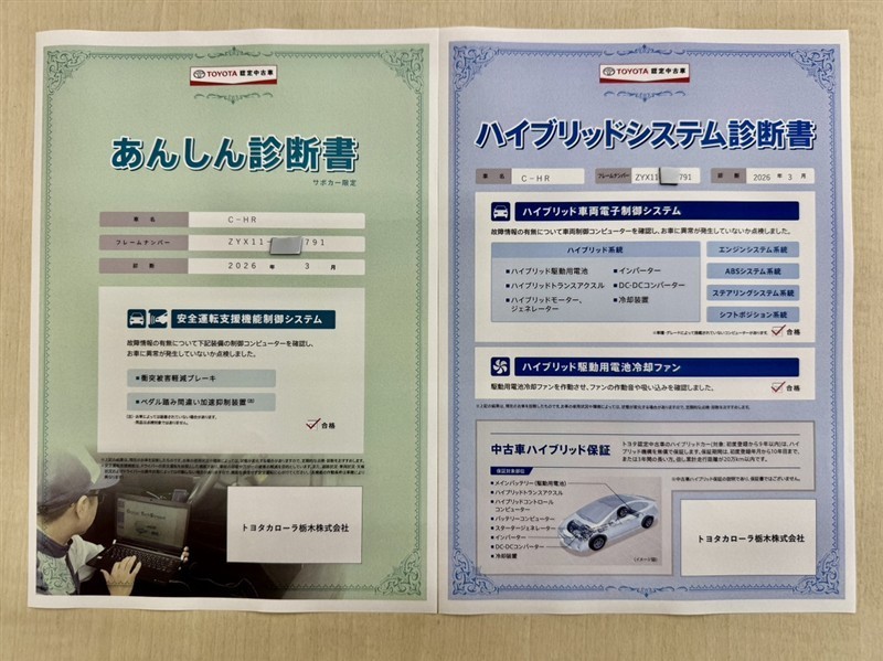 | 保証内容※1 | 保証付:ロングラン保証1年<走行距離無制限> +ハイブリッド保証<保証期間は初度登録年月から10年目まで、もしくは3年間のいずれか長い方。但し走行距離20万キロまで> |