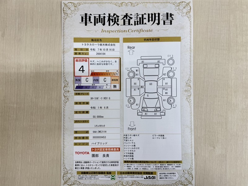 詳細及び現状の車両状態につきましては、店舗スタッフまでお尋ねください。 - 注2)上記と同様の評価点・状態表を「車両検査証明書」として店舗の展示車両に搭載しております。